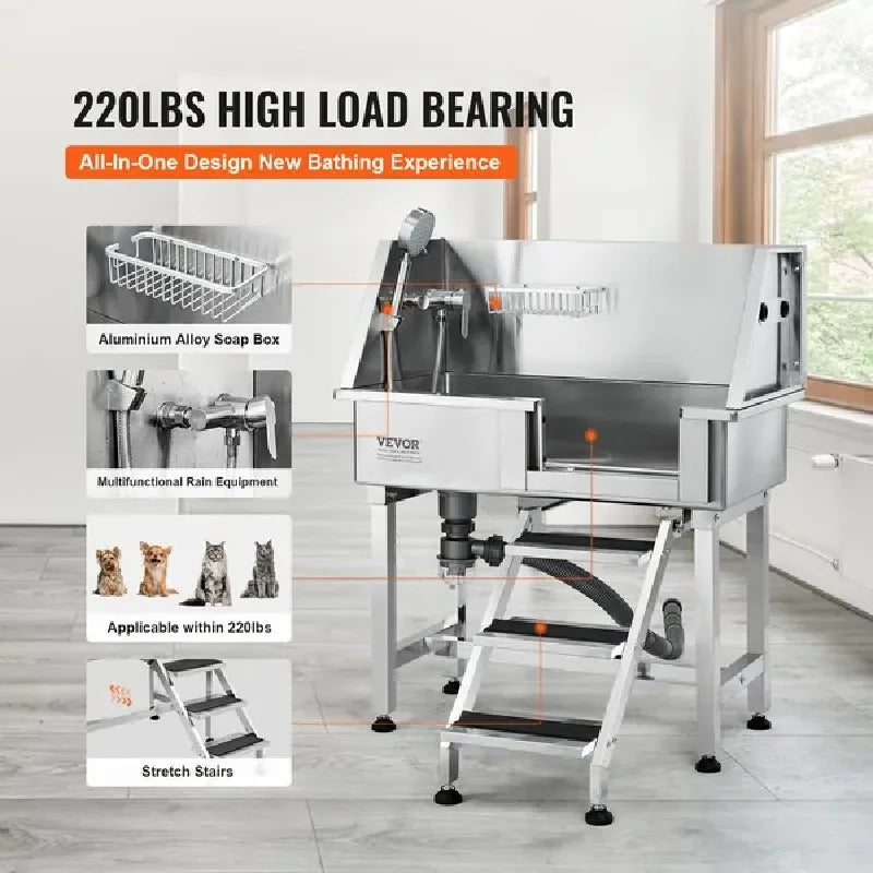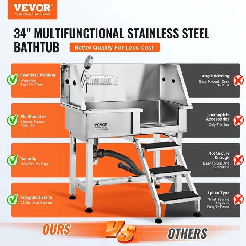 Seamless 34" Design: Our multi-functional stainless steel pet bath tub boasts seamless welding for a leak-free experience. It's perfect for pet owners and professional groomers who want a safe and hassle-free pet care solution.